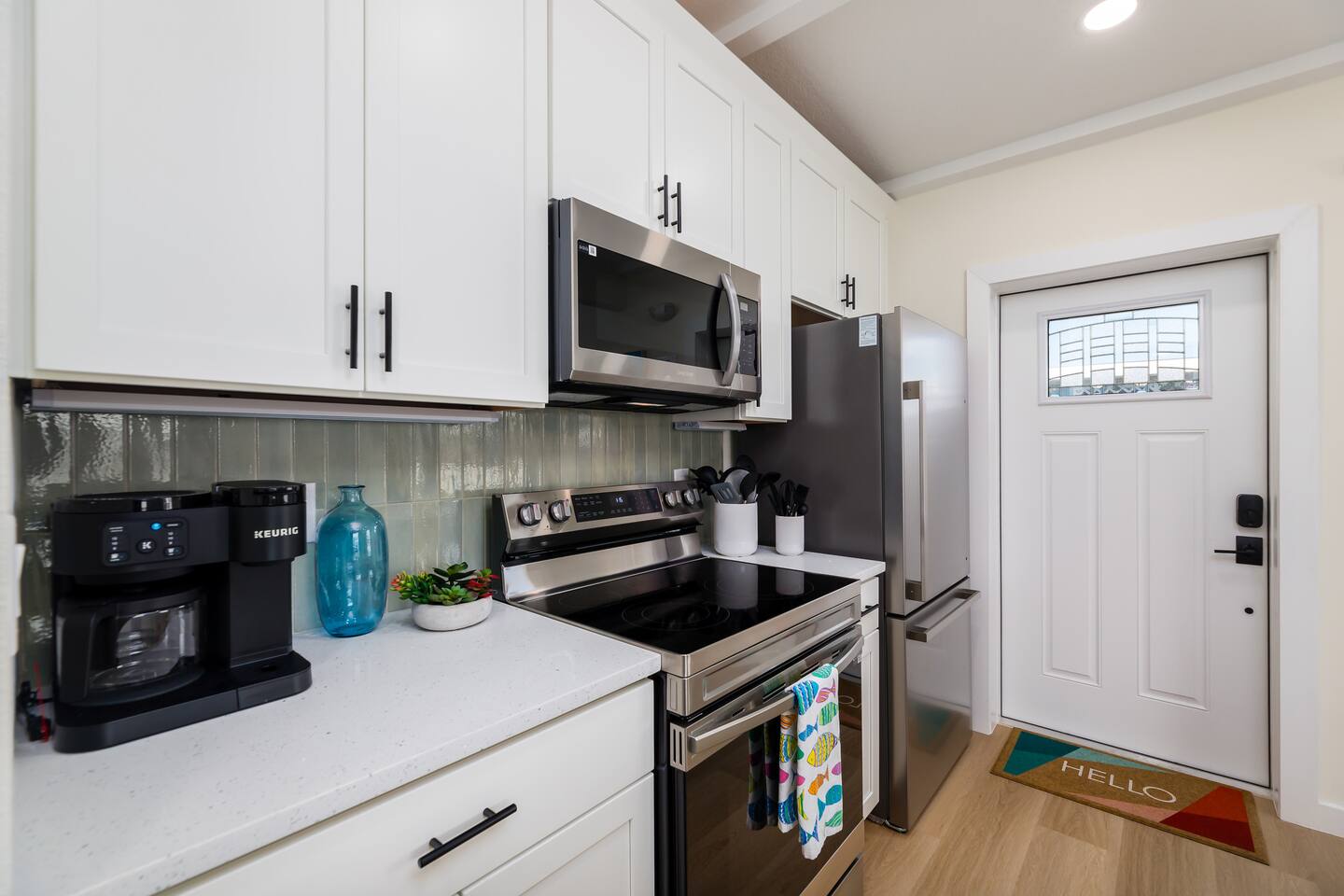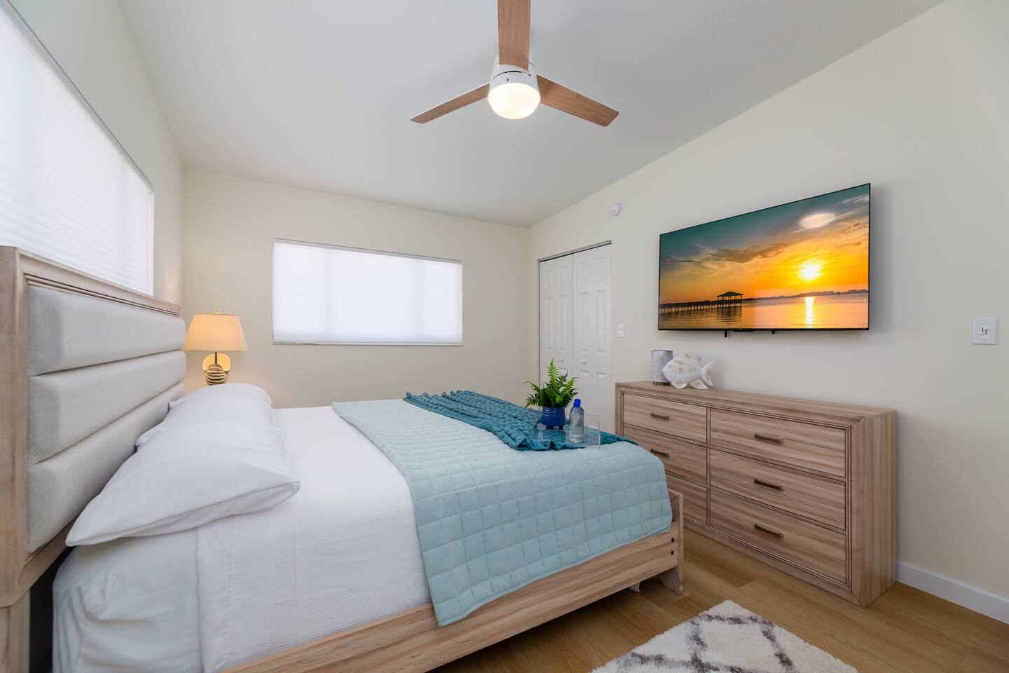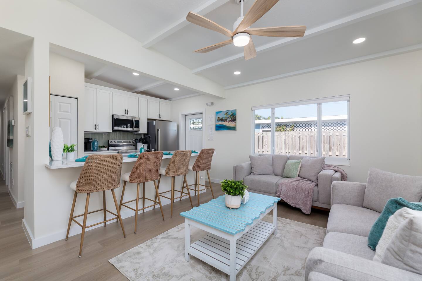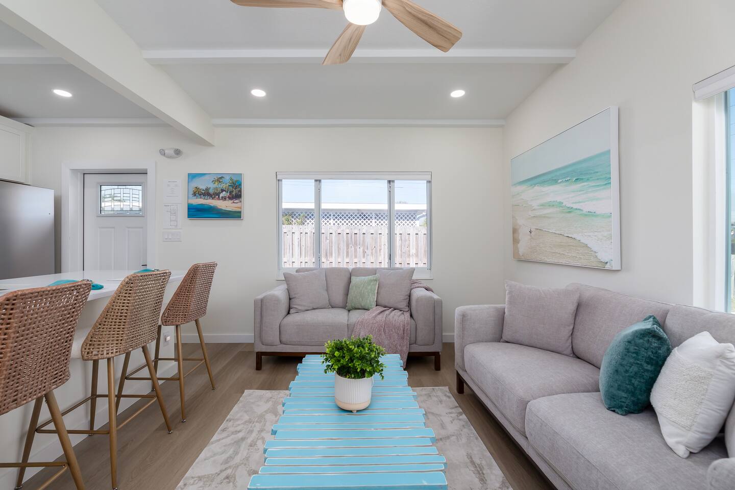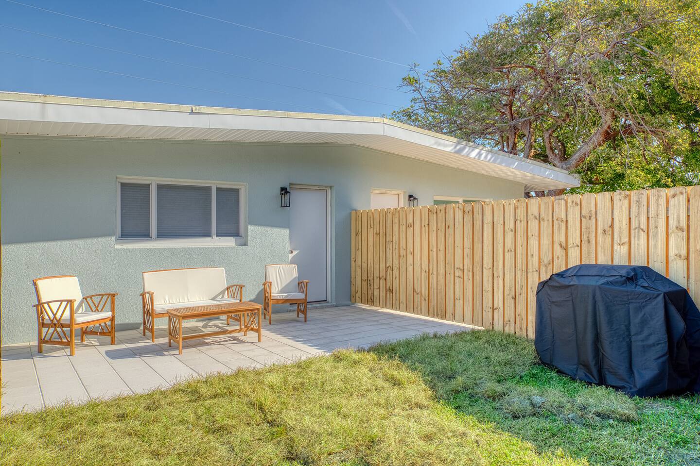 Living Area – The living area is furnished with a sofa and loveseat, coffee table, end table, ceiling fan, and a 65-inch smart TV. Bedrooms – 1 king and 1 queen bedroom. Both bedrooms include a dresser, nightstands, a ceiling fan, a small closet with hanging space, and a luggage rack. The king bedroom includes a 58-inch smart TV. Kitchen – A fully equipped kitchen with a refrigerator, dishwasher, range/oven, microwave, toaster, blender and coffee maker. Silverware, cutlery, dishes, glasses, baking pans, and cookware essentials are also included. A full sized washer and dryer are provided in the closet next to the kitchen. Bathroom – The bathroom is equipped with a walk-in shower, toilet, and vanity, plus travel sized shampoo, conditioner, body soap, and lotion. A hair dryer is also provided. Outdoors Features - Walk out the back door to your private, fenced backyard with patio, outdoor seating, coffee table, and a gas grill. *Please note the property is a duplex building (two units), however, each unit is separated by landscaping and has it's own private driveway and entrance.