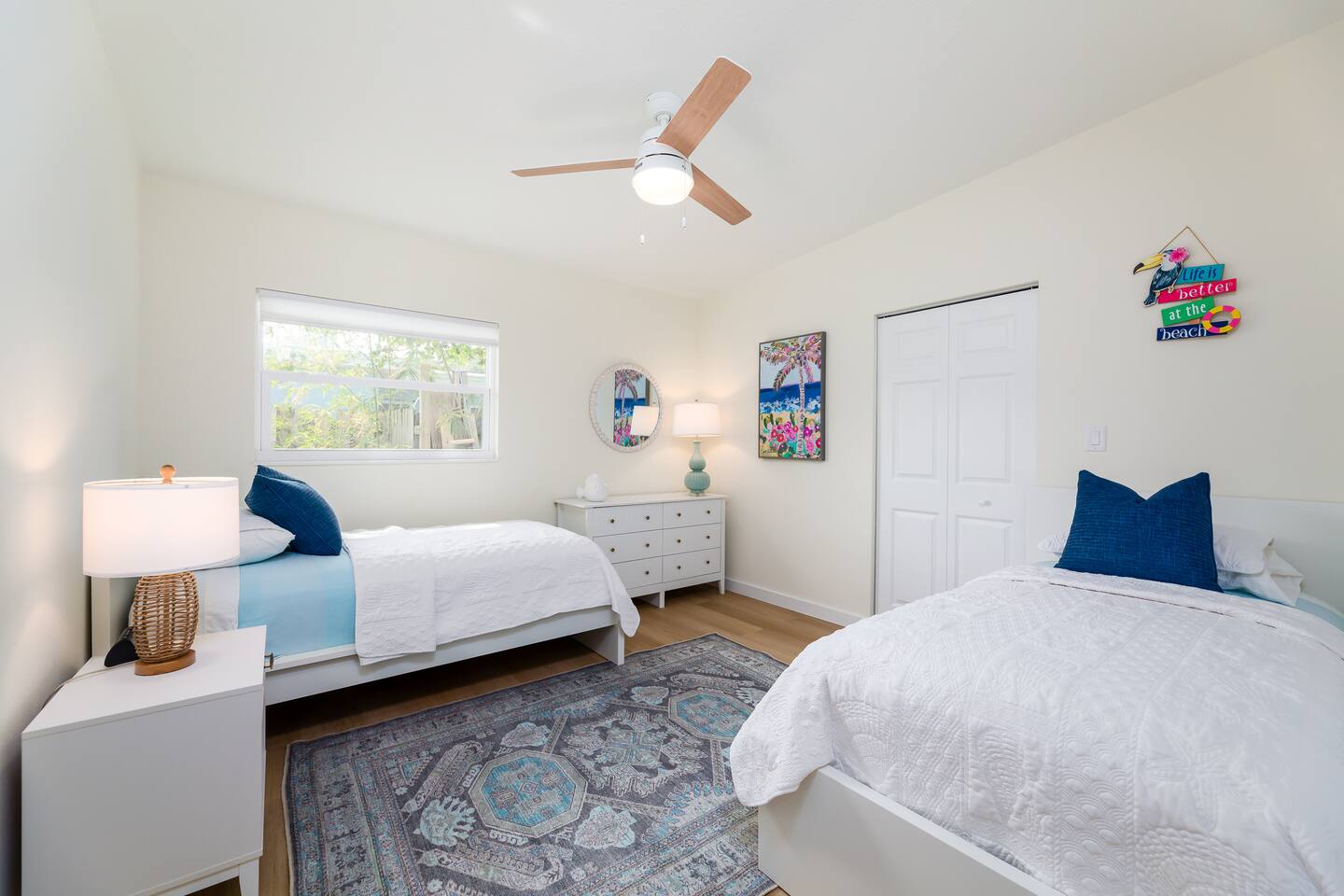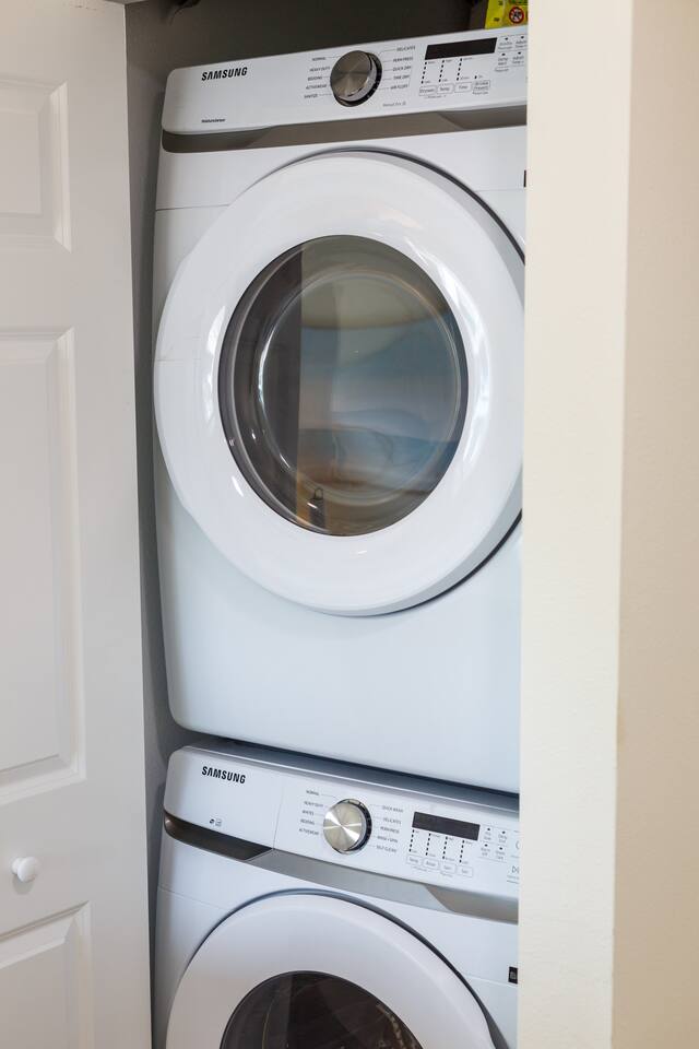 Living Area – The living area is furnished with a sofa and loveseat, coffee table, end table, ceiling fan, and a 65-inch smart TV. Bedrooms – One king bedroom and 2 twin beds in the second bedroom. Both bedrooms include a dresser, nightstands, a ceiling fan, a small closet with hanging space, and a luggage rack. The king bedroom includes a 58-inch smart TV. Kitchen – A fully equipped kitchen with a refrigerator, dishwasher, range/oven, microwave, toaster, blender and coffee maker. Silverware, cutlery, dishes, glasses, baking pans, and cookware essentials are also included. A full sized washer and dryer are provided in the closet next to the kitchen. Bathroom – The bathroom is equipped with a walk-in shower, toilet, and vanity, plus travel sized shampoo, conditioner, body soap, and lotion. A hair dryer is also provided. Outdoors Features - Walk out the back door to your private, fenced backyard with patio, outdoor seating, coffee table, and a gas grill. *Please note the property is a duplex building (two units), however, each unit is separated by landscaping and has it's own private driveway and entrance.